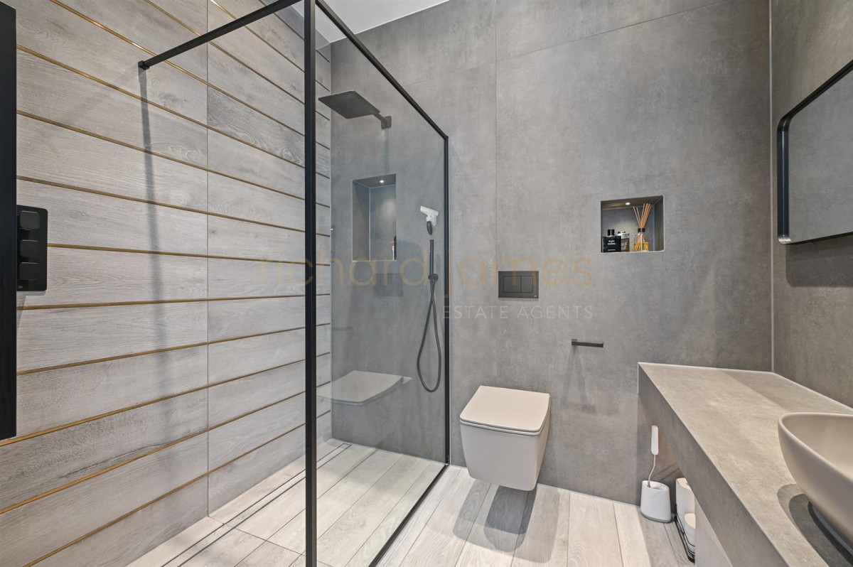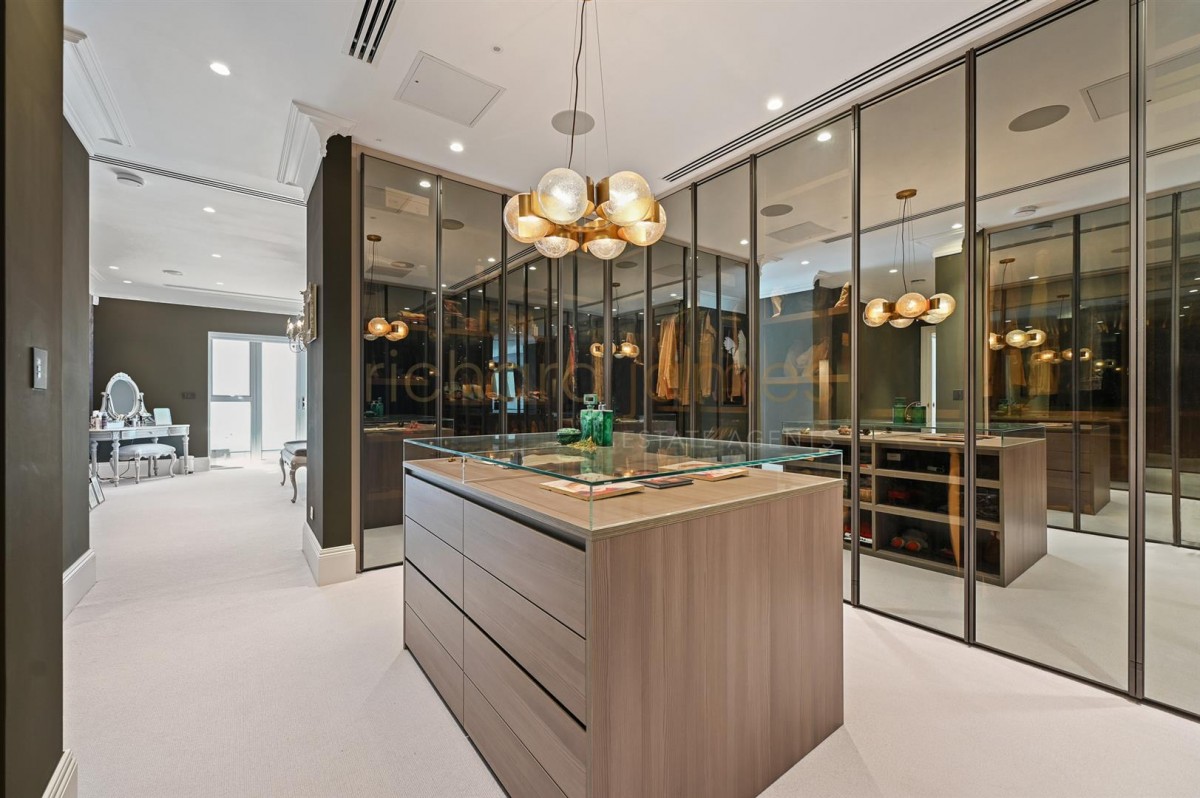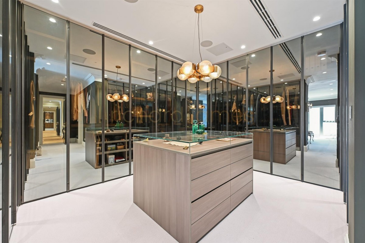 The sleek, modern kitchen is fitted with high-end integrated appliances and refined finishes. The luxurious master bedroom suite features a bespoke dressing room and an elegant en suite bathroom, forming a private, hotel-style retreat. Two further generously sized bedrooms each benefit from their own en suite bathrooms.