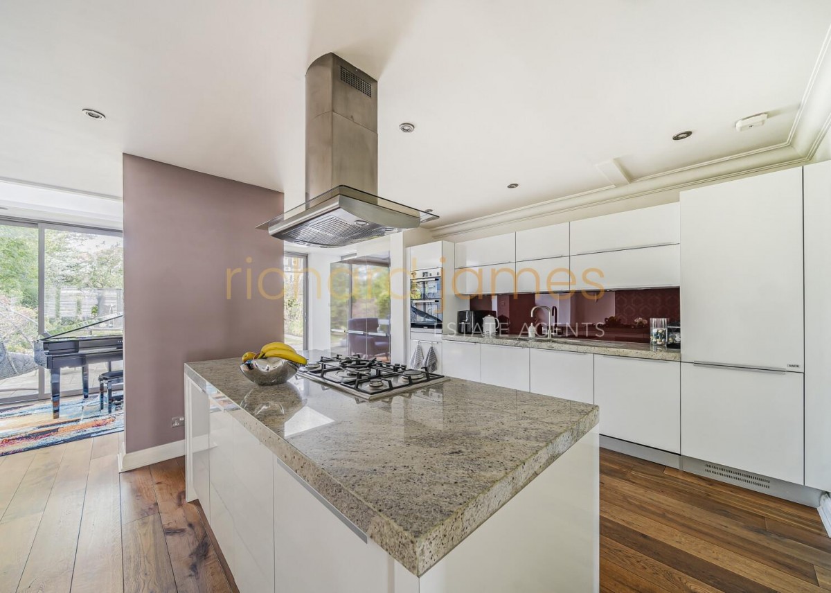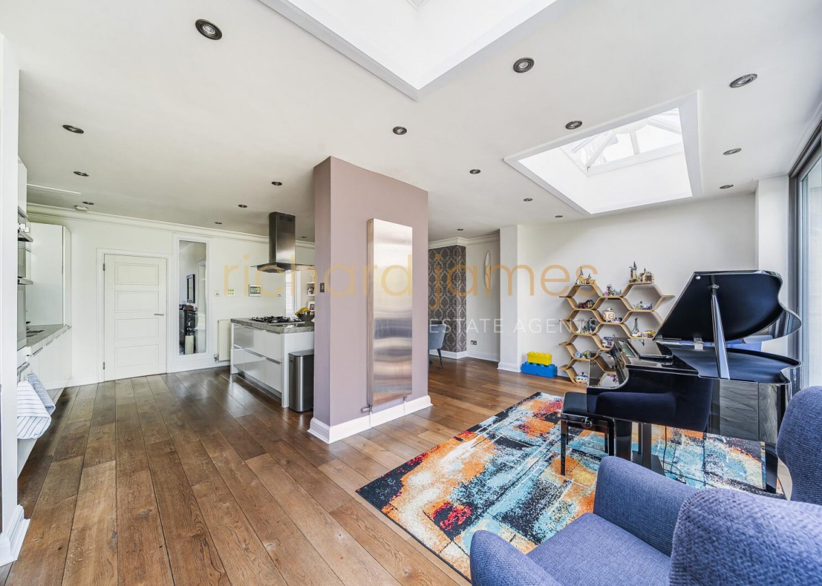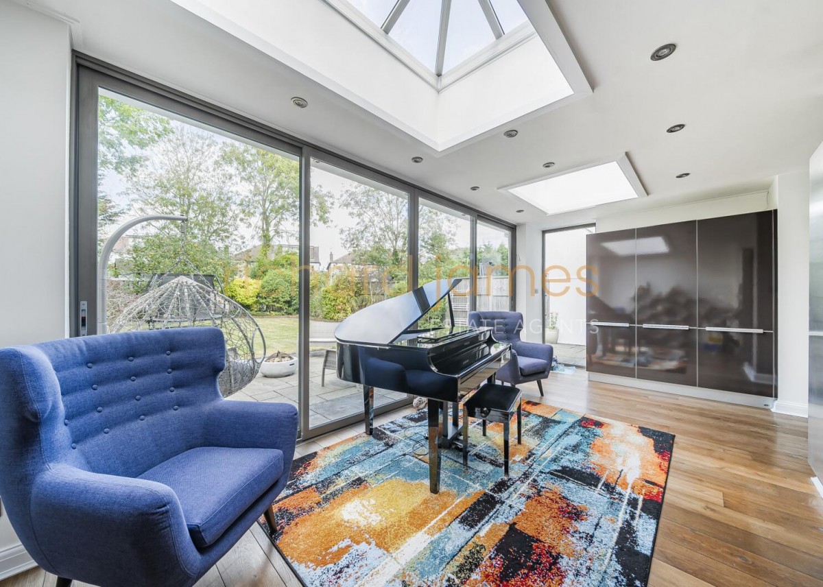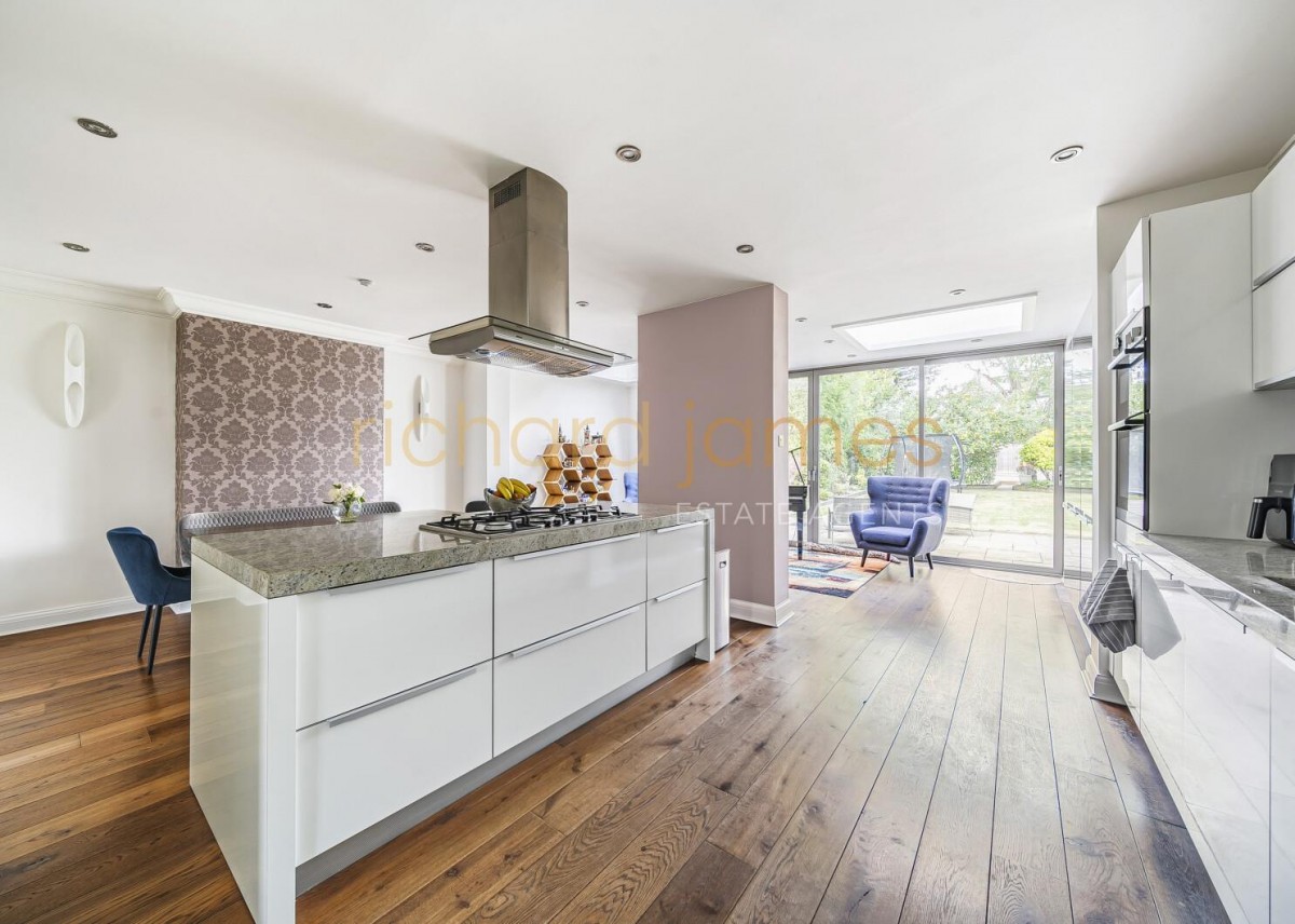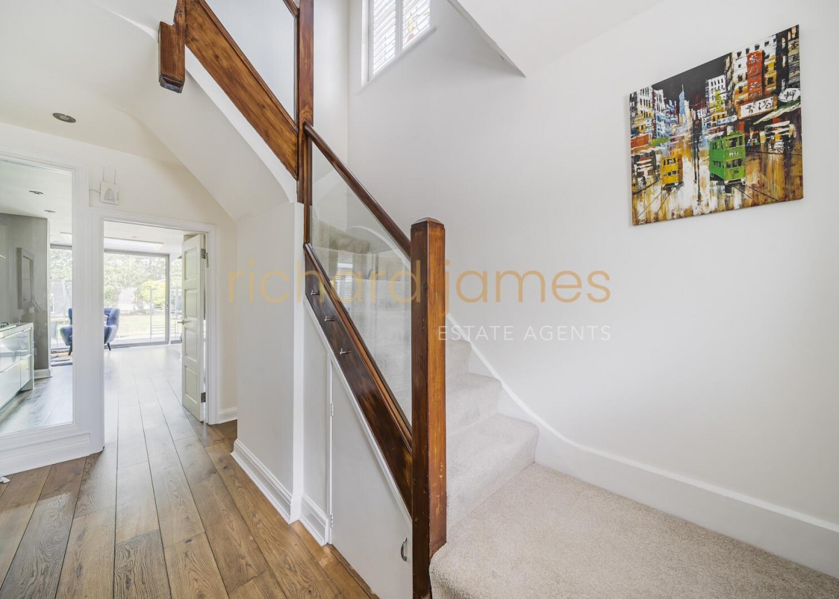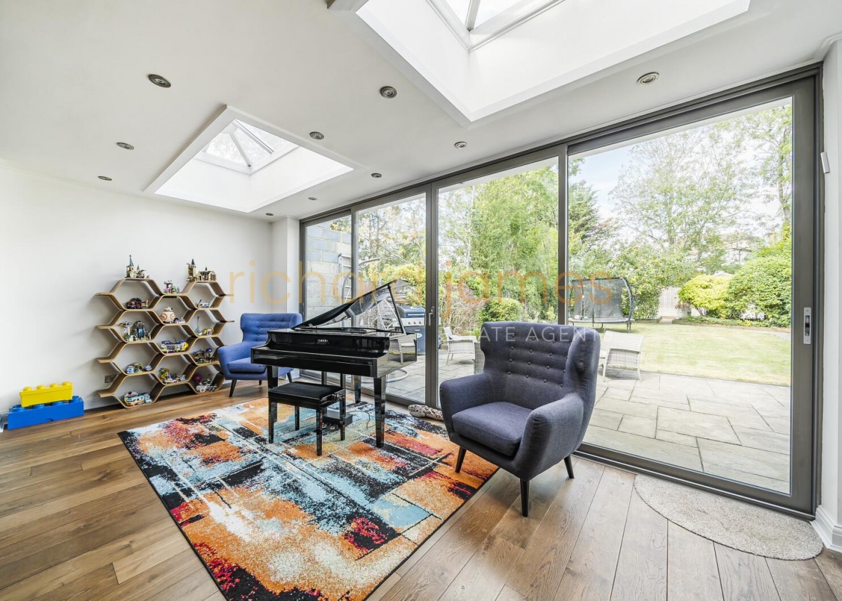 Having been skilfully extended and refurbished in recent years, the house offers versatile ground-floor living spaces, including a stunning kitchen/living/dining room with floor to ceiling doors opening onto the garden, a TV/family room, a study, a utility room, and a guest WC.