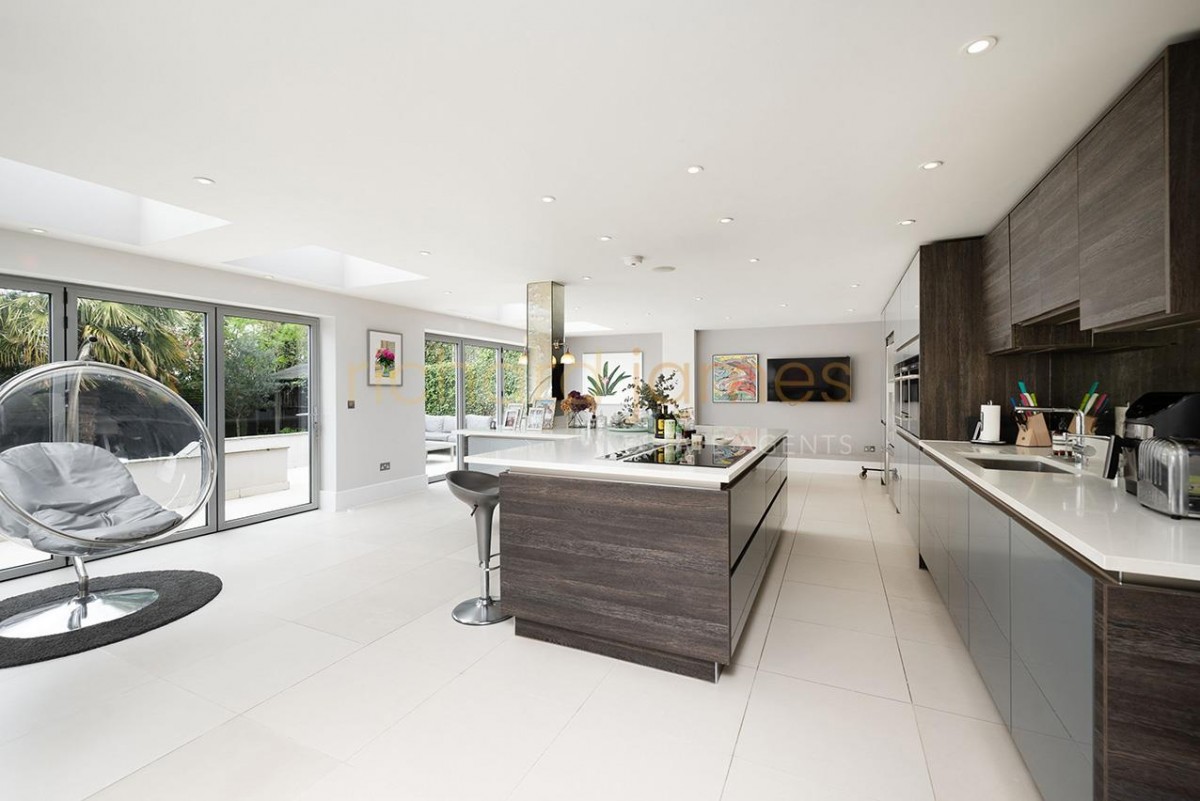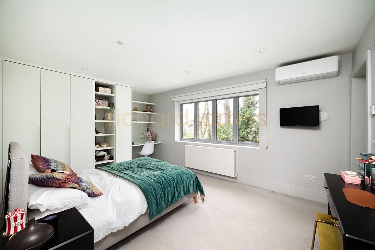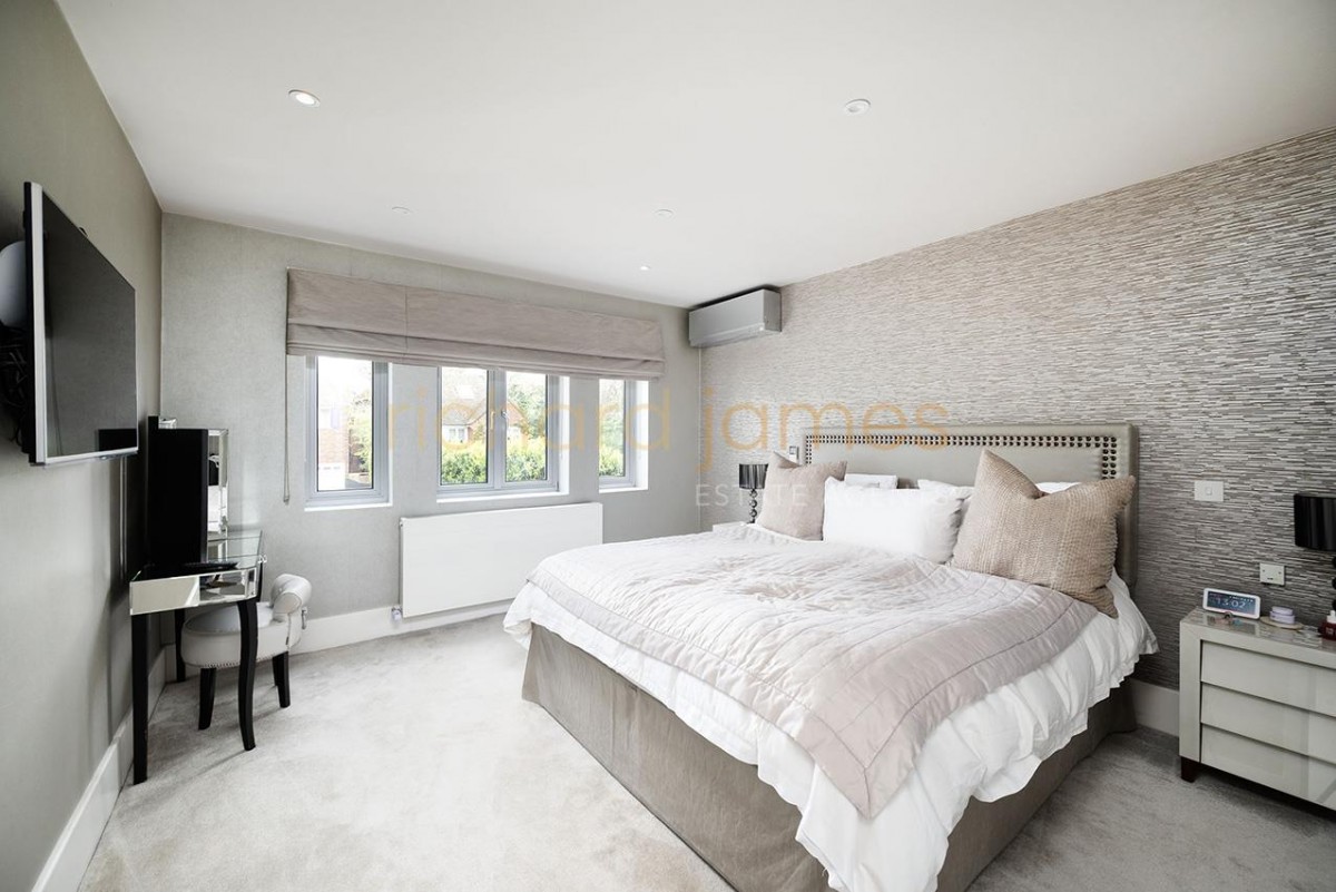 The ground floor includes a large entrance hall with spacious cloakroom / cupboards, guest WC, study, reception room, utility room and a spectacular kitchen/dining/family room with air conditioning and bi folding doors opening directly onto the landscaped rear garden and terrace.